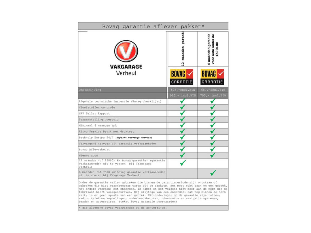 - Algehele Technische Inspectie - Vloeistoffen controle - NAP teller rapport - Tenaamstelling voertuig - Minimaal 10 maanden apk - Bovag afleverbeurt - Aircoservice beurt - 1 jaar Pechhulp Mobiliteit Service 24/7 Europa - Nieuwe accu - 12 maanden Bovag garantie op motor en versnellingsbak of 15.000 km, (reparatie en onderhoud werkzaamheden uit te voeren bij Vakgarage Verheul)