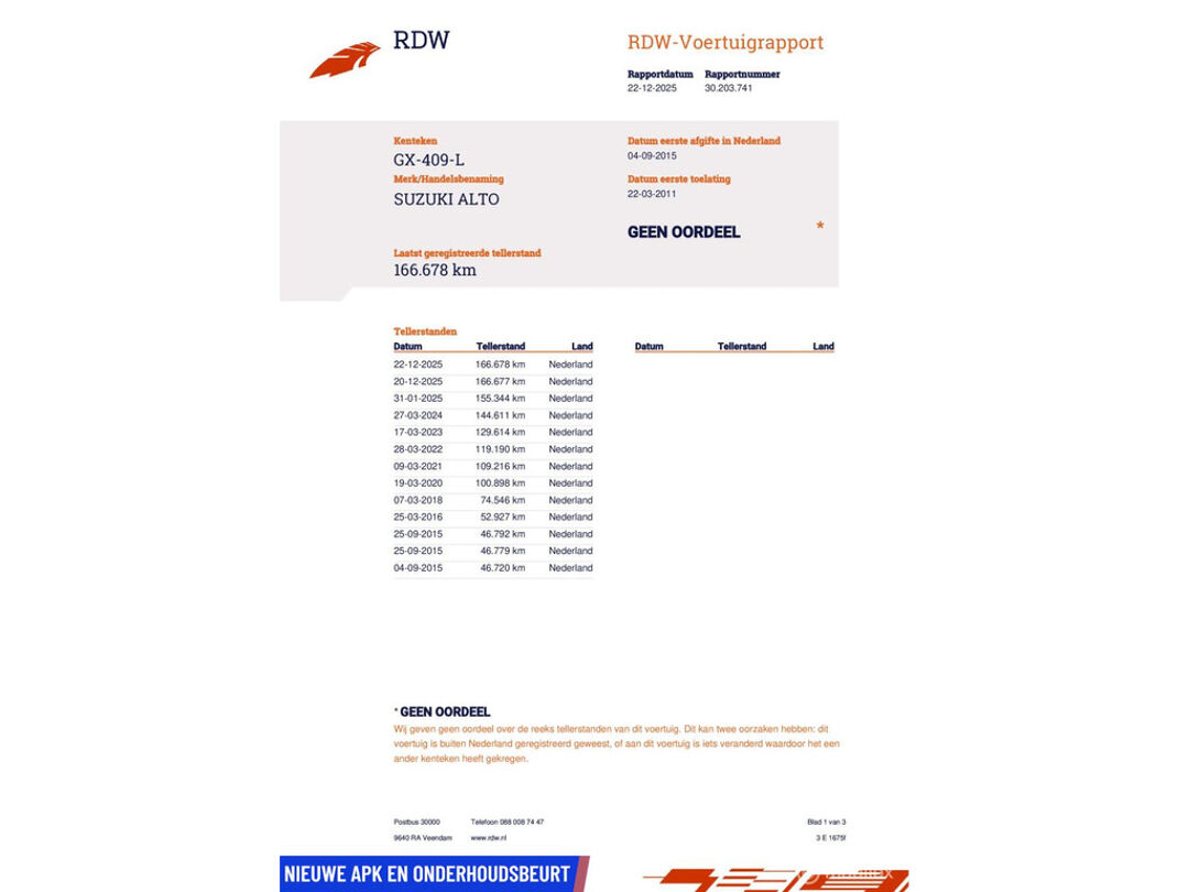 - Algehele technische inspectie - Vloeistoffen controle - Tenaamstelling voertuig - Minimaal 10 maanden apk - NAP teller rapport